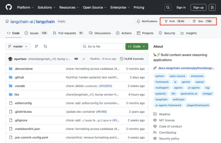 根据GitHub数据,LangChain目前已收获11.8万个Star与近2万个Fork,继续在开源开发者社区保持高热度。
